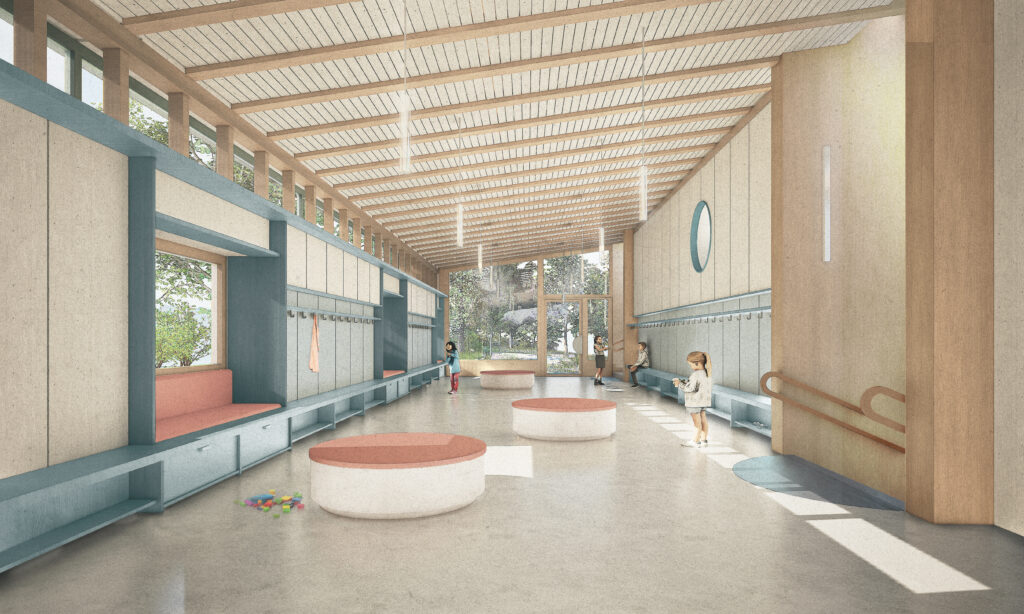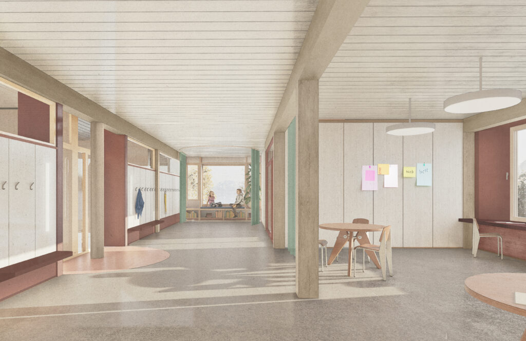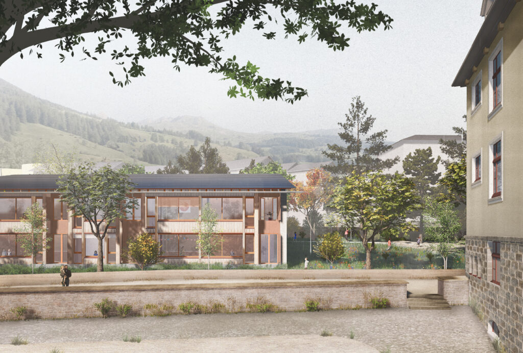Ils edifizis nouvs sun dominats da lain. «Uschè bler beton e fier sco chi fa dabsögn, uschè bler lain sco pussibel», descriva l’architect Gabriel Merkli l’idea. Ch’els s’allegran ferm da realisar uossa lur proget insembel cul cumün e ch’els sajan motivats da fabrichar üna bella scoulina ed üna bella scoula pels uffants e pellas persunas d’instrucziun.