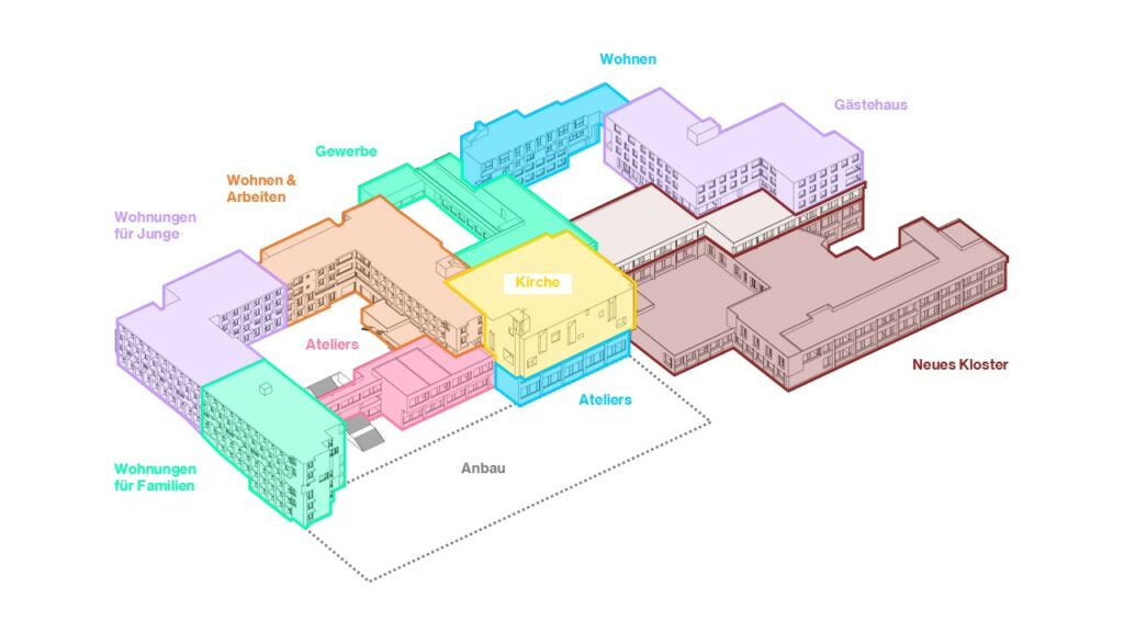 L’immobilia dalla claustra da Glion cumpeglia plirs tracts d’edifecis ch’ein vegni construi entuorn la baselgia. Il studi da realisabladad presentaus la stad 2025 visualisescha il diever futur pusseivel dalla claustra (mira visualisaziun). Sper ils differents basegns datti era ina proposta pil dacasa futur dalla nova cuminonza dallas soras dominicanas (la part «Neues Kloster»).