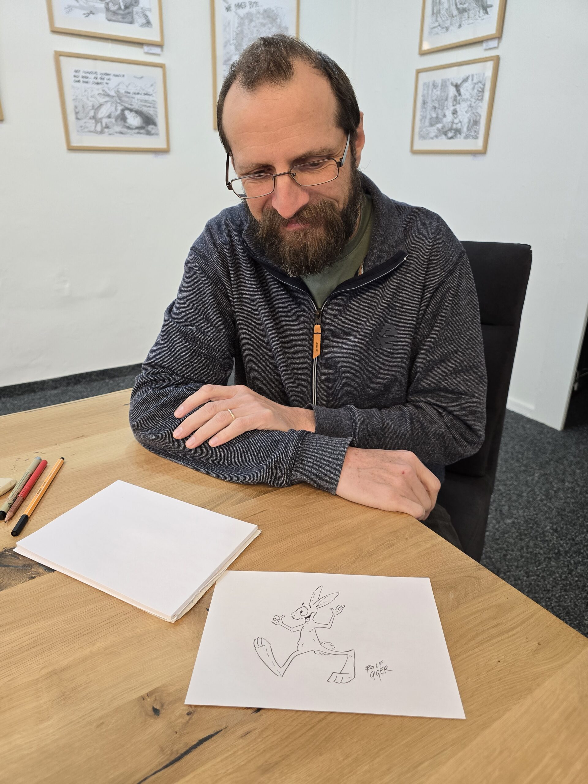 «Nus essan in bun team ed jau hai grond gust da mussar e dar vinavant co ch’ins po caracterisar l’expressiun da la fatscha ed il linguatg dal corp.» Rolf Giger ha dal rest fatg lavurs er per la «Sibla», la gasetta da tschaiver da Mustér. El collavura anc adina cun la Lia Rumantscha, la figura «Nin Palantin» per exempel è ina da sias creaziuns. Era per revistas spezialas, gasettas da tut gener e per projects da cudesch illustrescha Rolf Giger cuntinuadamain.