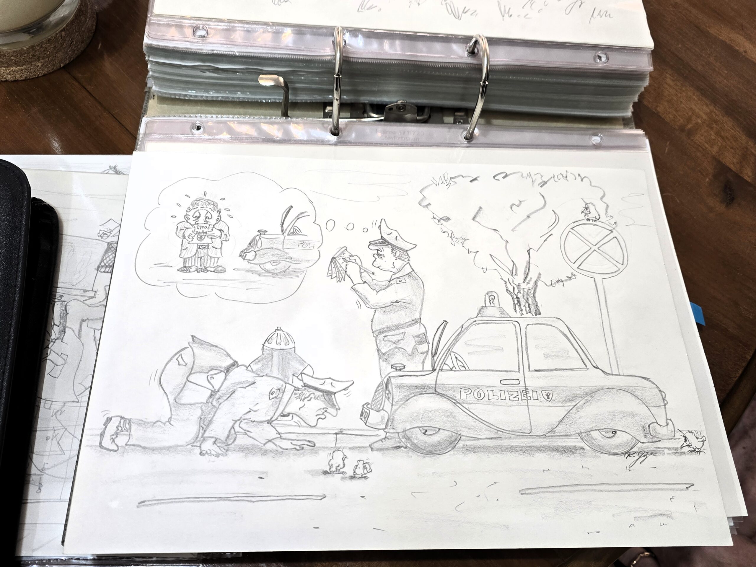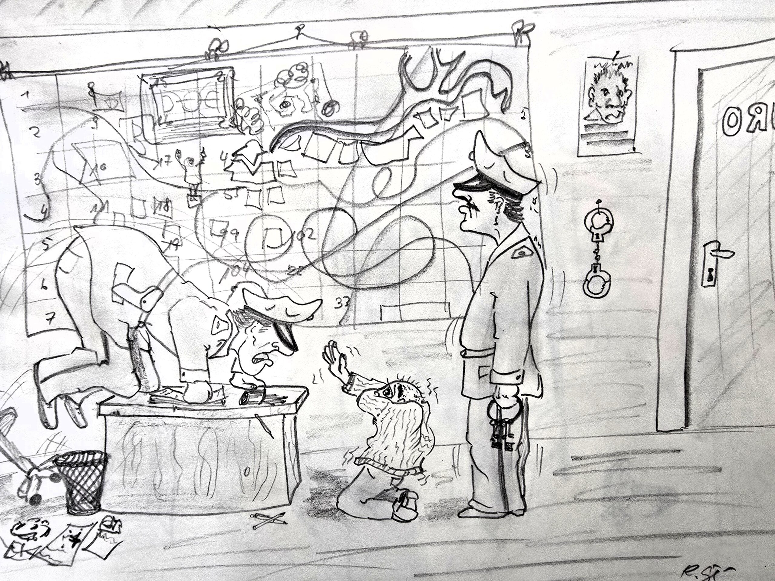 Sia emprima caricatura haja el pudì far en la vegliadetgna da 13 onns, tradescha Rolf Giger. A chaschun d’ina visita en il nov lieu «Haus der Illustration» a Cuira mussa el era quella. Mintga original dals dissegns ch’el ha fatg ha el conservà en mappas, tut è classà tenor sistem. In archiv nunditg da situaziuns ed istorgias. Uschia po el mussar la creaziun ch’el aveva fatg l’onn 1981 uffizialmain per la Polizia chantunala grischuna. La centrala a Cuira aveva vulì visualisar ina part da ses servetschs, ed il giuven talent aveva persvadì in dals funcziunaris responsabels. Uschia ha il mat pudì far diversas caricaturas che mussan ils policists en acziun – dissegnà cun in’egliada umoristica.