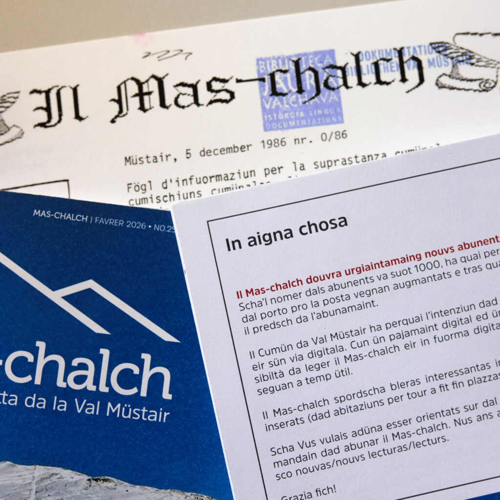 Il Cumün da Val Müstair infuormescha mais per mais cun seis Mas-chalch davart l’actualità politica, sociala ed economica. Ma perquai cha’ls abunamaints as diminuischan, pudess…